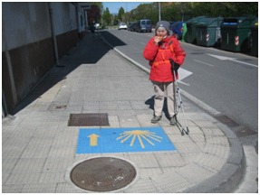 Le lendemain, direction Pampelune. Dès Burlaga, faubourg de Pampelune, le Camino est parfaitement balisé par des coquilles sur fond bleu peintes sur le sol.